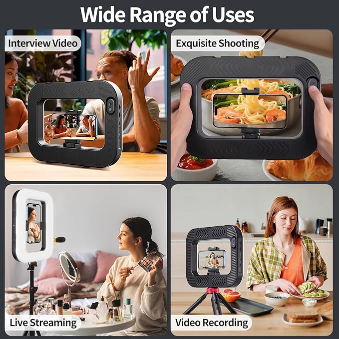 About this item【Steplessly Dimmable】 Our selfie ring light for phone camera is made of 200 high-brightness LED beads, the color temperature can be adjusted steplessly between 3000-9000K (warm, neutral, cold), and the brightness can be adjusted steplessly between 1-100% to meet your different environmental needs. The handheld iphone light for pictures has a color rendering index of up to 95+ for perfect fill light effect【Built-in Rechargeable Battery】 This cordless square iphone ring light battery powered has a built-in 8000mAh high-capacity battery and can be used continuously for 4 hours at maximum brightness. The led phone light ring for content creators can not only be used while charging, but also can be used as a temporary power source to charge mobile phones or other devices (Type-C input/USB output)